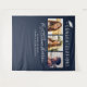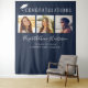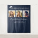Elegant dark blue graduation party photo booth backdrop tapestry featuring "Congratulations" in large white typography and an illustration of a white graduation cap on top, a three photo collage, her name in a trendy stylish white script, and her class year and school name in simple modern white typography.