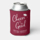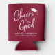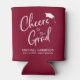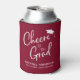 A fun burgundy can cooler to celebrate the graduate. "Cheers to the Grad" is written in a modern white script with a grad cap on top and you can personalise his or her name, class year and school in white typography. Customised colours to your school colours by clicking "customise further."