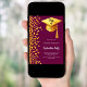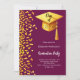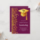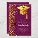 A modern, elegant Graduation party invitation. A burgundy background decorated with faux gold confetti and a large golden graduation cap with tassel. Personalise and add a name and party details. White text.