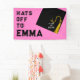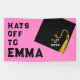 Creative graduation congratulations banner featuring a black and gold cap on a pink background. To personalise edit text to and name and senior class year.