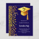 A modern, elegant Graduation party invitation. A dark blue background decorated with faux gold confetti and a large golden graduation cap with tassel. Personalise and add a name and party details. White text.