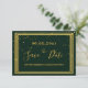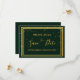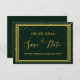 A Save the Date card for a Graduation Party party. Emerald green background decorated with golden confetti and a faux gold frame. Personalize and add a date and name. Golden colored letters. The text: Save the Date is written with a large trendy hand lettered style script.