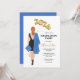 Graduation Party Invitation female portrait drawing black dress, blue cap and gown, red hair in a high ponytail. 2024 gold balloons.