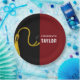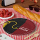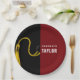 Creative graduation congrats party plates featuring classic black and gold cap on a maroon background. Edit text to add grad's name.
