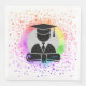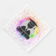 Colourful paper napkin has a graduation theme cap and gown, with a watercolor inspired splattered background. HAMbyWhiteGlove aka HAMbWG