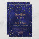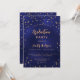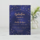 A glamourous invitation card for a graduation party for both him and her. A navy blue background decorated with faux gold stars. The blue colour is uneven. Personalise and add a name and party details. The text Graduation and the name are written with modern hand lettered style script. Golden coloured text.