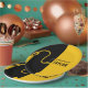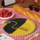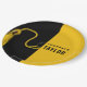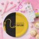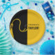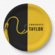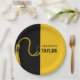 Creative graduation congrats party plates featuring classic black and gold cap on a yellow background. Edit text to add senior class grad's name.