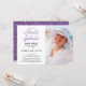 Send out cool, modern, customisable graduation invitations for your graduate's celebration. Replace the sample photo and text with your own to make it unique. Personalise it for any graduate: high school, college, graduate school, law school, medical school, trade school. The invite features the words "celebrate the graduate" in a violet watercolor script font on a white background. The black text colours can be changed by clicking the "Customise" button. On the back, a decorative painted pattern of scrolling white curves meet and diverge on a violet background.