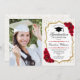 Graduation party invitation with your photo. Elegant design in white, gold and red. Features script font, red roses, tassel, faux glitter gold and confetti. Perfect for a stylish celebration.