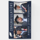 Elegant dark blue graduation party welcome banner and photo backdrop to celebrate the graduate with "Congratulations" in large white typography, an illustration of a graduation cap, a three photo collage and his or her name, class year and school name in modern white typography. The background and text colours can be edited to match your school colours by selecting "customise further."