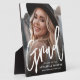 This simple and minimalist graduation easel table top sign or plaque features a full-page photo with a sleek and modern layout. “Grad” is displayed in elegant handwritten script, with the graduate’s name, “Class of 2026,” and the school name below in classic fonts for a clean and polished look.
