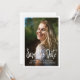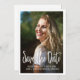 Graduation photo Save the Date / announcement card formatted vertically with calligraphy script text. The back of the card is plain white, but the colour is customisable with Zazzle's design tool. Contact us for help with customisation or to request matching products.