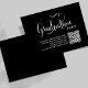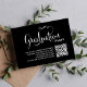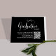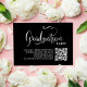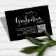This design features a graduation QR code party invitation, with a modern calligraphy minimalist template, with black and white typography, a simple invitation insert, details info information details, a grad party information info details, great for graduate high school or college, great for party invitation insert card, with a scan scannable QR code details, with a graduation hat cap mortarboard