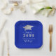 Elegant personalised royal blue and silver graduation party paper plates featuring a faux metallic silver foil graduation cap, silver confetti, fancy calligraphy script typography and class year with CONGRATULATIONS and your graduate's name against an editable royal blue background colour you can change to a school colour or coordinating party theme colour by clicking EDIT. ASSISTANCE: For help with design modification or personalisation, colour change, transferring the design to another product or you would like coordinating items, contact the designer BEFORE ORDERING via Zazzle Chat or makeitaboutyoustore@gmail.com.