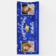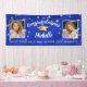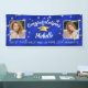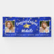 Celebrate your graduate and/or decorate for a graduation party with this royal blue and gold star themed banner personalised with two photos, your graduate's name and your custom text at the bottom (the sample shows school and class year). The title CONGRATULATIONS NAME is in an editable handwritten script font against an elegant faux brushed metallic royal blue background. PHOTO TIP: Choose photos with the subject in the middle and/or pre-crop into square shapes BEFORE uploading. Use the CROP tool to adjust the image within the template. ASSISTANCE: For help with design modification or personalisation, colour change, resizing, transferring the design to another product or if you would like coordinating items, contact the designer BEFORE ORDERING via the Zazzle Chat MESSAGE tab below or email makeitaboutyoustore@gmail.com.
