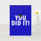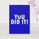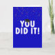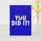 Bright blue "you did it" sign with a black graduation cap and colourful confetti on blue background.