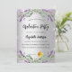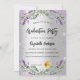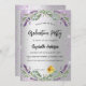 A modern, stylish graduation party invitation. A faux silver looking background with violet faux sparkles, lavender florals, flowers and eucalyptus greenery. Personalise and add the name and party details.