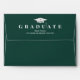 This design features graduation graduate grad party, a modern mortar board cap hat, a basic 5x7 a7 envelope size, a dark forest green simple minimalist minimal, a traditional mortarboard mortar board, with a return address back flap printed, a plain clean simplistic minimalist, a graduation party invitation envelope, a graduation announcement envelope, a dark forest green grad party envelope