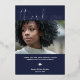 These elegant graduation thank you cards feature two photos of the graduate, with modern silver foil script typography and a silver foil image of a graduation cap and tassel on a dark, navy blue background.