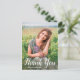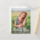 This custom photo graduation thank you postcard features a photo on the front with the word "Thank You" in white script with your name to personalize. Add a message of thanks on the back of the card and signature accented by a black graduation cap on white. Designed by artist ©Susan Coffey.