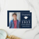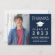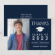 This custom photo graduation thank you card features a photo on the left and to the right a typography design of white text on blue accented by a graduation cap. Add a message of thank you on the back of the card and signature or delete it. Designed by artist Susan Coffey.