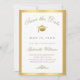 Send your family and friends an elegant graduation save the date announcement featuring a white background with fuax gold calligraphy and gold grad cap bordered by a gold frame. Personalise with your graduation details. Designed by Susan Coffey.