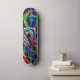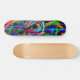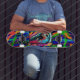 This skateboard design features a graffiti inspired eye staring out from abstract destruction art. A bright and colourful board to get exercise and have fun. Most of all, it is cool and gets a rider there. Adults, teens, kids.