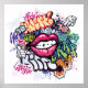 Graffiti illustration with street graffiti letters, tags, words, street art, style, crap, kick, tap, lips, tiger, spray paint, emoji, fresh and colorful, cartoon hand,