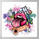 Graffiti illustration with street graffiti letters, tags, words, street art, style, crap, kick, tap, lips, tiger, spray paint, emoji, fresh and colourful, cartoon hand,