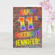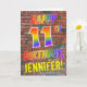 The front of this vibrant, exciting and fun birthday-themed greeting card design features the message "HAPPY 11TH BIRTHDAY" with letters having a multicolored rainbow like gradient pattern, and a editable name coloured yellow, on a wall-of-bricks pattern background. The look is inspired by that of graffiti or street art drawn on a wall. The inside features a customisable birthday greeting message. A happy, fun, personalised birthday greeting card like this might be given to somebody who is celebrating their 11th birthday. [~Z0000357]