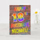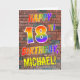 The front of this fun, exciting and eye-catching birthday-themed greeting card design features the message "HAPPY 18TH BIRTHDAY" with letters having a multicolored rainbow like gradient pattern, and a custom name coloured yellow, on a wall-of-bricks pattern background. The style is inspired by that of graffiti or street art drawn on a wall. The inside features a customised birthday greeting message. A fun, happy, customised birthday greeting card like this might be a special way to send a birthday greeting to somebody celebrating their eighteenth birthday. [~Z0000357]