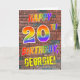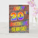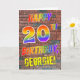 The front of this eye-catching, exciting and fun birthday-themed greeting card design features the message "HAPPY 20TH BIRTHDAY" with letters having a multicolored rainbow like gradient pattern, and a customisable name coloured yellow, on a wall-of-bricks pattern background. The appearance is inspired by that of graffiti or street art drawn on a wall. The inside features a customisable birthday greeting message. A fun, happy, personalised birthday greeting card like this might be a special way to celebrate somebody’s 20th birthday. [~Z0000357]
