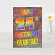 The front of this eye-catching, fun and exciting birthday-themed greeting card design features the message "HAPPY 24TH BIRTHDAY" with letters having a multicolored rainbow like gradient pattern, and a editable name coloured yellow, on a brick wall pattern background. The style is inspired by that of graffiti or street art drawn on wall. The inside features a customisable birthday greeting message. A fun, happy, customisable birthday greeting card like this might be given to celebrate somebody’s 24th birthday. [~Z0000357]