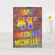 The front of this vibrant, exciting and eye-catching birthday-themed greeting card design features the message "HAPPY 41ST BIRTHDAY" with letters having a multicolored rainbow like gradient pattern, and a editable name colored yellow, on a brick wall pattern background. The appearance is inspired by that of graffiti or street art drawn on wall. The inside features a personalized birthday greeting message. A happy, fun, customizable birthday greeting card like this might be given to somebody who is celebrating their forty-first birthday. [~Z0000357]