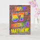 The front of this exciting, eye-catching and vibrant birthday-themed greeting card design features the message "HAPPY 57TH BIRTHDAY" with letters having a multicolored rainbow like gradient pattern, and a customizable name colored yellow, on a brick wall pattern background. The style is inspired by that of graffiti or street art drawn on wall. The inside features a customized birthday greeting message. A fun, happy, editable birthday greeting card like this might be used to send a birthday greeting message to somebody celebrating their fifty seventh birthday. [~Z0000357]