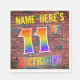 The front of this eye-catching, exciting and fun birthday-themed paper napkin design features a personalised name, and the message "11TH BIRTHDAY!" with letters having a multicolored rainbow spectrum inspired gradient pattern, on a brick wall inspired pattern background. The style is inspired by that of street art or graffiti drawn on a wall. Fun paper napkins like this might be used at a birthday party being held to commemorate somebody’s 11th birthday. [~Z0000367]