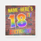 The front of this fun, exciting and eye-catching birthday-themed paper napkin design features a custom name, and the message "18TH BIRTHDAY!" with letters having a multicolored rainbow spectrum inspired gradient pattern, on a brick wall inspired pattern background. The style is inspired by that of street art or graffiti drawn on a wall. Fun paper napkins like this might be used at a birthday party being held to celebrate somebody’s eighteenth birthday. [~Z0000367]