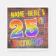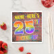 The front of this vibrant, exciting and eye-catching birthday-themed paper napkin design features a customisable name, and the message "25TH BIRTHDAY!" with letters having a multicolored rainbow spectrum inspired gradient pattern, on a brick wall inspired pattern background. The look is inspired by that of graffiti or street art drawn on a wall. Fun paper napkins like this might be used at a birthday party being held to commemorate somebody’s twenty fifth birthday. [~Z0000367]