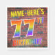 The front of this vibrant, exciting and fun birthday-themed paper napkin design features a custom name, and the message "77TH BIRTHDAY!" with letters having a multicolored rainbow spectrum inspired gradient pattern, on a brick wall inspired pattern background. The style is inspired by that of graffiti or street art drawn on a wall. Fun paper napkins like this might be used at a birthday party for somebody who is celebrating their seventy seventh birthday. [~Z0000367]