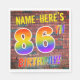 The front of this exciting, vibrant and eye-catching birthday-themed paper napkin design features a customisable name, and the message "86TH BIRTHDAY!" with letters having a multicolored rainbow spectrum inspired gradient pattern, on a brick wall inspired pattern background. The appearance is inspired by that of graffiti or street art drawn on a wall. Fun paper napkins like this might be used at a birthday party for somebody who is celebrating their 86th birthday. [~Z0000367]