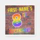 The front of this vibrant, fun and exciting birthday-themed paper napkin design features a customisable name, and the message "8TH BIRTHDAY!" with letters having a multicolored rainbow spectrum inspired gradient pattern, on a wall-of-bricks inspired pattern background. The appearance is inspired by that of street art or graffiti drawn on a wall. Fun paper napkins like this might be used at a birthday party being held in honour of somebody’s eighth birthday. [~Z0000367]