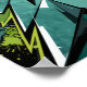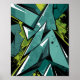 A dynamic graffiti artwork featuring sharp geometric shapes, 3D crystal-like surfaces, and bold contrasts of green, turquoise, black, and white. The background is filled with vibrant paint splashes and splatters, creating a sense of energy, motion, and street-style chaos. This abstract street art design combines urban graffiti aesthetics with modern geometric abstraction.