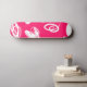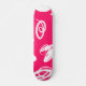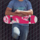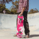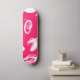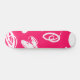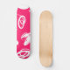 This skateboard exhibits a cool bold design, composed by a pink surface with elliptical white lines and small rounded shapes on it.