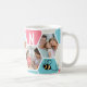 Honeycomb coffee mug, personalised with 5 of your favourite photos and printed with a 4 letter name, such as GRAN. The design features a honeycomb photo collage in a pretty colour palette of summer blue pink and alabaster, with a cute little bee. If you want to change the colours, click "customise further" and click each hexagon that you want to change.