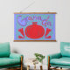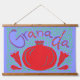 Original illustration of bold red pomegranate apple with flowers and decorative playful hand lettering saying Granada. A Spanish city vibe design, summer vibe red and blue. Travel poster original artwork,Spain destination.
