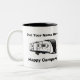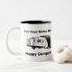 This coffee mug is available in a variety of colours and you can change the name on the top to personalise it to your name. It has a travel trailer design similar to a Grand Design Reflection 297RSTS travel trailer and the words "happy campers" on the bottom. This message can also be changed to whatever you would like. You can also change the colour of the interior of the cup to one of several different colours. It holds 11oz and has a large handle to make it easy to hold even when full. It is both microwave and dishwasher safe.