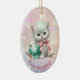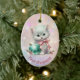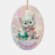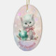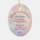 Here's a beautiful keepsake ornament for the first Christmas of that very special granddaughter. The front has an image of an adorable white kitten wearing a pink bow and sitting with a pretty teal tree bulb. The image is placed on a pale pink and lavender bokeh background. There is a custom text field at the bottom that currently says "First Christmas", but you may change the text or remove it completely, if you'd like. The back of the ornament has the same background, with text fields for you to customise. Make it say whatever you'd like!