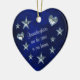 This is a wonderful Christmas ornament for a grandparent to give to a granddaughter. It features small, shiny heart and star images against a deep blue gradient background on each side. Very elegant and pretty! In the centre is your customised text in white. Currently, the front side says "Granddaughters are the stars in our hearts", with the back side holding your child's name and your message. All the text is fully customisable, so you may make it say whatever you'd like. This is a special keepsake gift that your granddaughter will treasure forever.