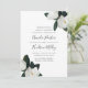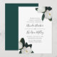 Elegant and graceful floral wedding invitation features chic white magnolia flowers and dark green leaves at the corners, framing your wedding details in hand lettered script, block and italic typefaces. Invitations reverse to rich green.