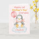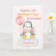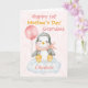 A cute and sweet Penguin design 1st Mother's Day Holiday Card featuring a baby girl penguin holding a pink balloon whilst sitting on a cloud with the baby's name on it, with a pale pink background, A lovely card to give to new grandmothers nanna, nana, nan, from their new baby granddaughter to celebrate their first mothers day as a new Grandparent. All text can be customised to suit your needs then personalise by amending the inside message.